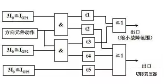 如圖所示,零序方向電流保護(hù)I段或II段動(dòng)作后,首先通過(guò)短延時(shí)t1或t3跳母聯(lián)或跳本側(cè)開(kāi)關(guān),以縮小故障影響范圍,如果故障量仍然存在,則通過(guò)長(zhǎng)延時(shí)t2或t4跳三側(cè)開(kāi)關(guān)切除變壓器。無(wú)方向的III段,通過(guò)延遲直接切除變壓器。