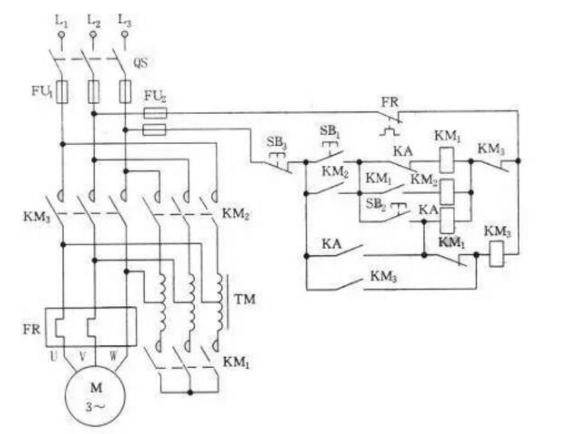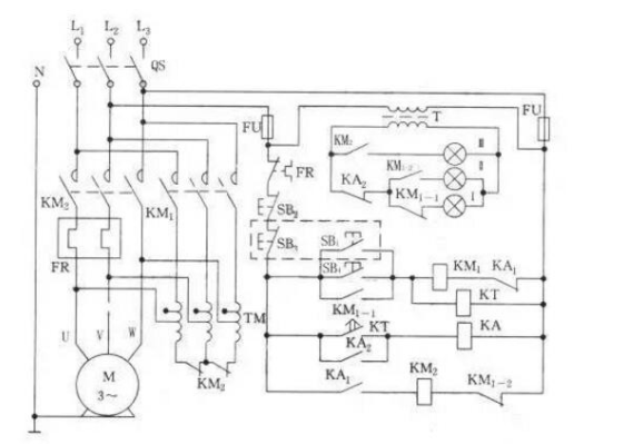 控制器:由KM1,KM2,KM2接觸器,KT,中間繼電器KA和SB1、SB4和起動按鈕SB2、SB3組成。二個啟動按鈕并聯,兩個停機按鈕串聯組成了兩地控制功能。SB1、SB3(虛線框)組成了甲地控制的啟動,停止按鈕。SB4,SB2組成了控制的啟動,停止按鈕。