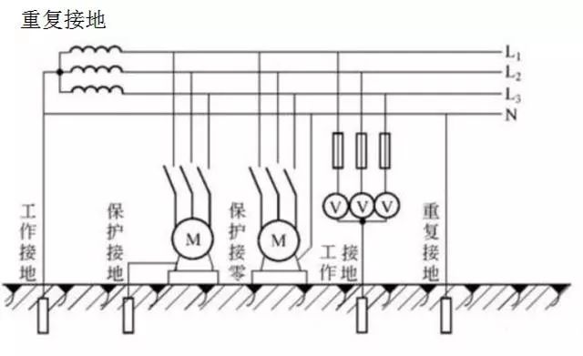 ③中性線必須重復(fù)接地,因?yàn)楫?dāng)中性線斷開(kāi)時(shí),接零設(shè)備外殼上有220V對(duì)地電壓,這是絕對(duì)不允許的。